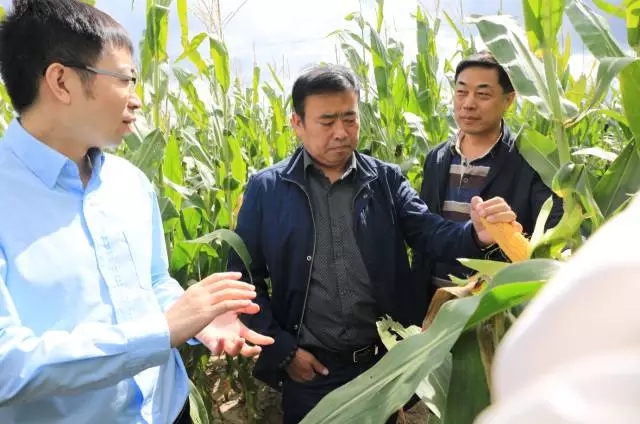 孟远夺(左)、马兵(中)与陈国庆查看玉米长势.
